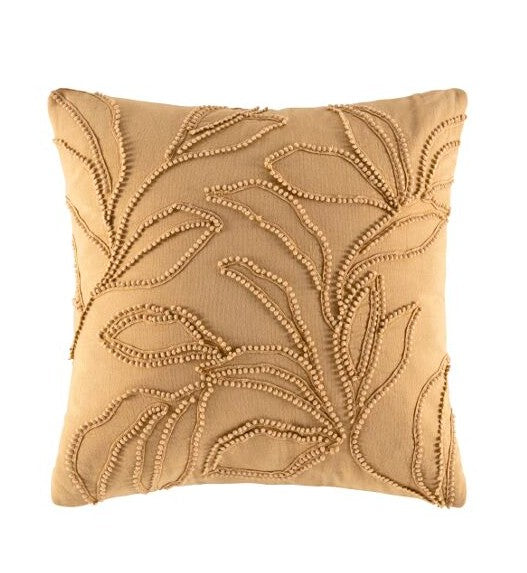 Ein stilvolles Zierkissen, das mit seiner feinen Struktur und dem kunstvollen, plastischen Blattmuster sofort Wärme und Behaglichkeit in jeden Wohnraum bringt. Das hochwertige Baumwollmaterial sorgt für ein angenehm weiches Gefühl und macht das Kissen zu einem perfekten Begleiter für Sofa, Lounge oder Schlafzimmer.