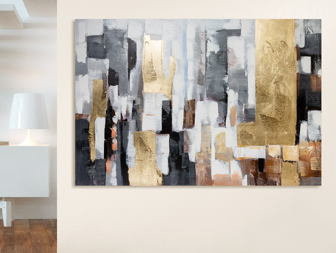 Gemälde Rechteck, handbemalt auf Leinwand mit Holzrahmen. Abstraktes Design in Grau & Gold – elegante Wanddekoration für moderne Wohnräume.