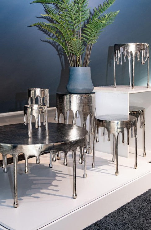Die Tischserie Drop ist ein echtes Design-Statement. Ihre fliessenden, tropfenförmigen Formen aus massivem Aluminium verleihen jedem Raum eine aussergewöhnliche, fast skulpturale Eleganz. Die glänzende Oberfläche reflektiert das Licht auf faszinierende Weise und schafft ein Ambiente, das sowohl verspielt als auch luxuriös wirkt.