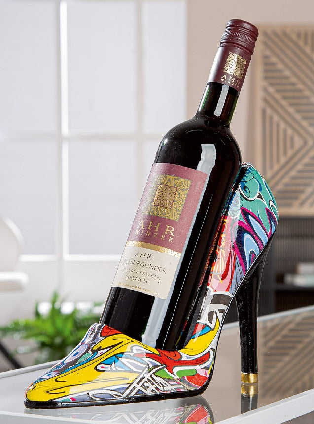 Flaschenhalter Pumps aus Kunstharz in 2 Designs: Street Art & Modern Art. Kreativ, stilvoll & dekorativ – origineller Halter für Weinflaschen.
