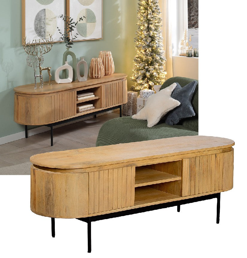 Die harmonisch gerundeten Seiten verleihen dem Design eine weiche, fließende Form, während die vertikale Struktur auf den Fronten für eine dezente Raffinesse sorgt. Die offenen Fächer in der Mitte bieten Platz für Mediengeräte oder dekorative Lieblingsstücke, während die schwarzen Metallbeine einen modernen Kontrast setzen und dem Möbelstück eine elegante Leichtigkeit verleihen.