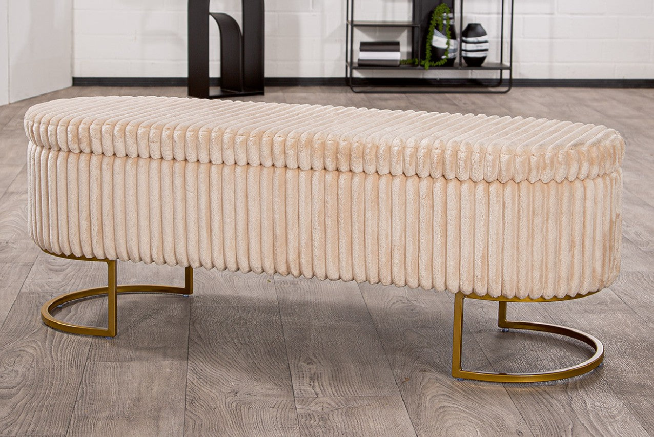 Polsterbank Bridget in Beige mit goldfarbenen Füssen. Elegant, komfortabel und aufklappbar mit Stauraum – stilvolle Neuheit 2026.