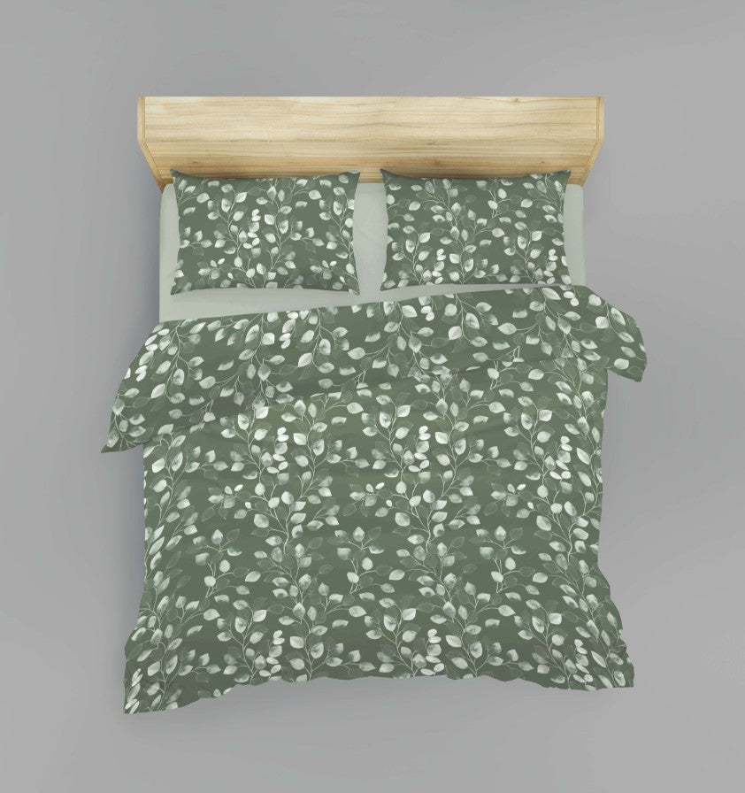 Die Satin Bettwäsche Penelope von Interior3000 bringt Ruhe, Natürlichkeit und Gemütlichkeit in Ihr Schlafzimmer. Das feine Blattmuster in harmonischen Grüntönen schafft eine entspannte, einladende Atmosphäre und lädt zum Abschalten, Wohlfühlen und Zusammensein ein.