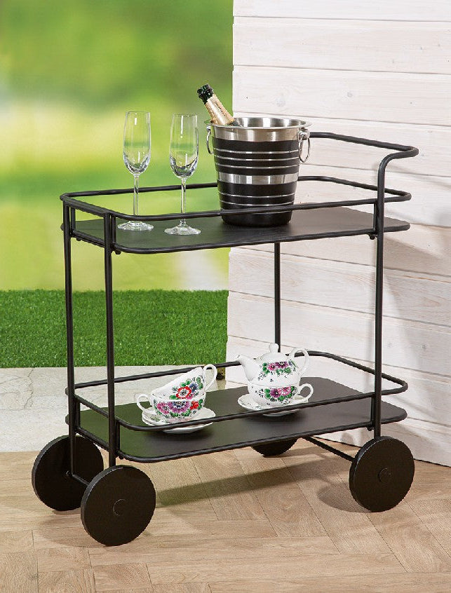 Eleganter Servierwagen aus Metall in matt Schwarz – flexibel auf Rollen, perfekt für Weinabende & stilvolles Servieren. Masse: L43 x B75 x H73 cm.