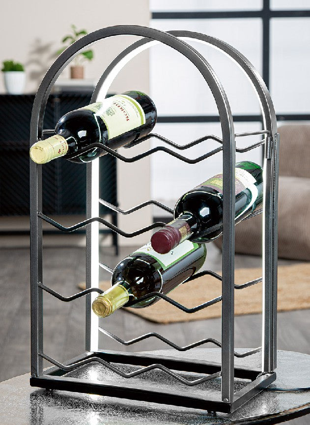 Elegantes Weinregal Roberta aus Eisen, Grau, mit LED-Beleuchtung für 12 Flaschen. Stilvoll, praktisch und perfekt für unvergessliche Weinabende.